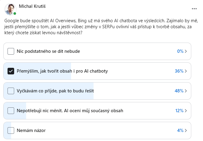 Zeptal jsem se anketkou na Facebookové SEO skupině. Velká část (48 %) z 25 hlasů vyčkává co bude. Přesto už se našlo jedinců, kteří o tom přemýšlí (36 %) a 3 hlasy ( 12 %) předpokládá, že generují dobrý AI obsah.
