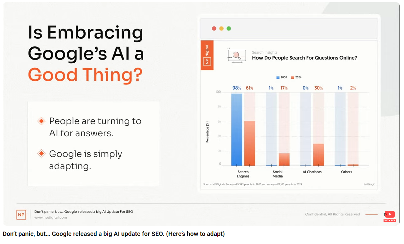 Obrázek: Jak se změnilo vyhledávání od roku 2000 - od vyhledávačů se přesouvá k AI chatbotům a sociálním médiím. Niel Patel - Don’t panic, but..