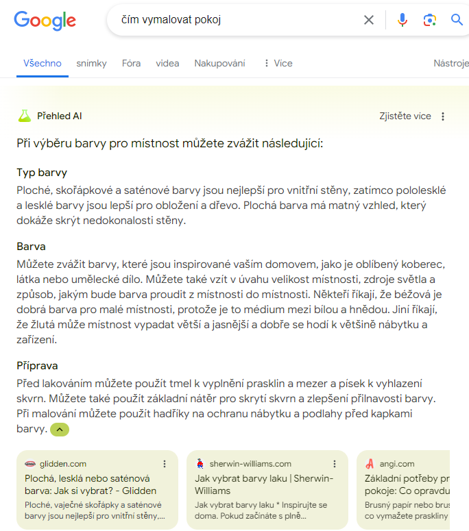 Obrázek: Odpověď na dotaz “what to paint the room with” v Google Labs službě AI Overviews po automatickém překladu do češtiny