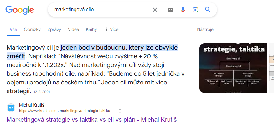 Proč by na můj web někdo měl kliknout, když už nyní dostane relevantní odpověď na dotaz “marketingové cíle” na featured snippetu? Nebo na něj klikne a už druhá pozice dostává o dost méně návštěv. Nebo změní dotaz “tipy marketingových cílů” a počká si na nově vygenerovanou odpověď.