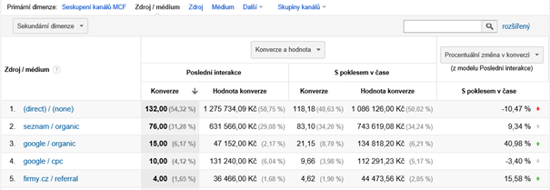 Na první pohled vidíme, že každý model dává každému kanálu jinou hodnotu. Dosud jsme vyhodnocovali všechny kampaně pomocí základního modelu Poslední nepřímý proklik (last click non-direct). Nyní vidíme, které kanály jsme podhodnocovali. A rozdíly mohou být opravdu zásadní. Zde se totiž ukazuje, že některé modely jsou výhodnější pro určité marketingové kanály a jiné jim naopak přiřknou menší vliv. V ukázkovém příkladu je zřejmý velký rozdíl například u neplacené návštěvnosti z Google (google/organic), která v případě druhého zvoleného modelu (S poklesem v čase) získává vliv na dalších 40,98 % konverzí než u defaultního modelu (Poslední interakce).