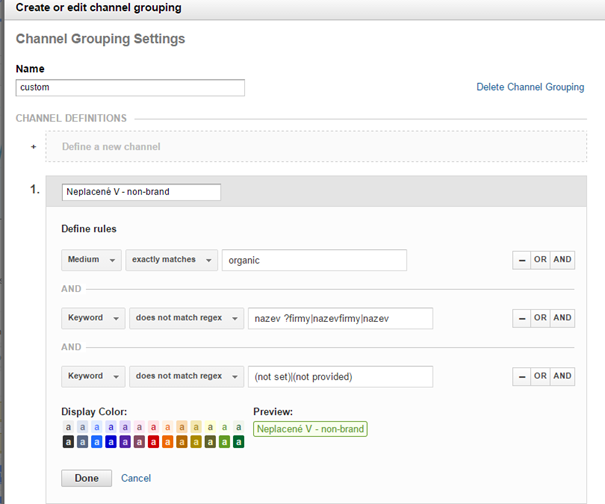 Než začnete cokoliv analyzovat, je výhodnější vytvořit si vlastní pojmenování pro kanály. Direct bude vždy direct, ale třeba máte více typů e-mailingových kampaní, několik dominantních serverů, které na vás odkazují, nebo specifické bannerové kampaně.