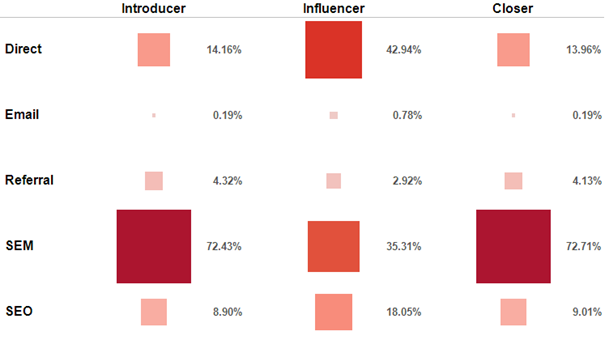 V souladu s frameworkem See-Think-Do lze ještě každý kanál rozdělit, zda otevírá konverzní cesty, je uprostřed či cesty uzavírá. Na to se potřebujeme zaměřit hlavně při hledání vlivů jednotlivých kanálů mezi sebou.