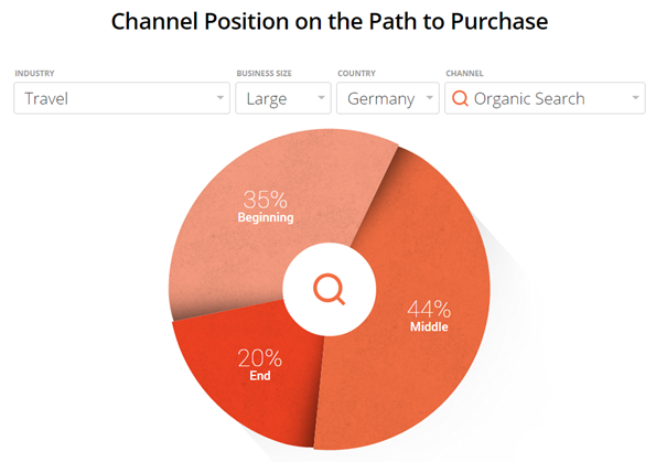 Obrázek 5: Jak se neplacené vyhledávání zapojuje v konverzních cestách u velkých německých webů zaměřených na cestování.