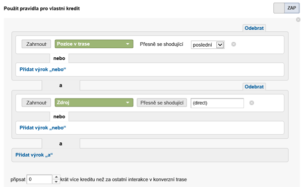 Konkrétní nastavení kreditů u vlastního atribučního modelu vypadá takto: