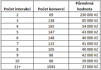 Tabulka: Délka konverzních cest, počet uskutečněných konverzí a jejich průměrná hodnota