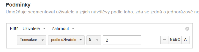 Obrázek: Nastavení segmentu zákazníků v Google Analytics, kteří nakoupili 2x a více.