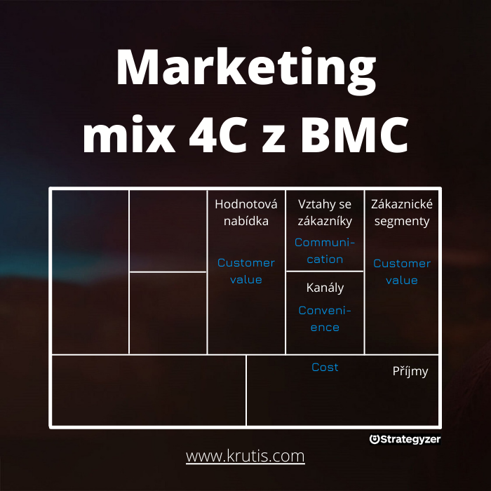 Já pracuji s Business Model Canvasem při tvorbě strategií. Po vyplnění tohoto plátna stavíme marketingový mix. Pokud jdeme přes 4C, pak lze využit tyto konkrétní bloky BMC pro sestavení 4C.