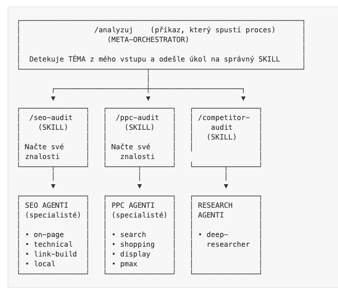 TÉMA = Široká doména znalostí (SEO, PPC, analytika, …) SKILL = Workflow orchestrátor, který načte knowledge base a deleguje práci AGENT = Exekutor konkrétního úkolu s jasným checklistem