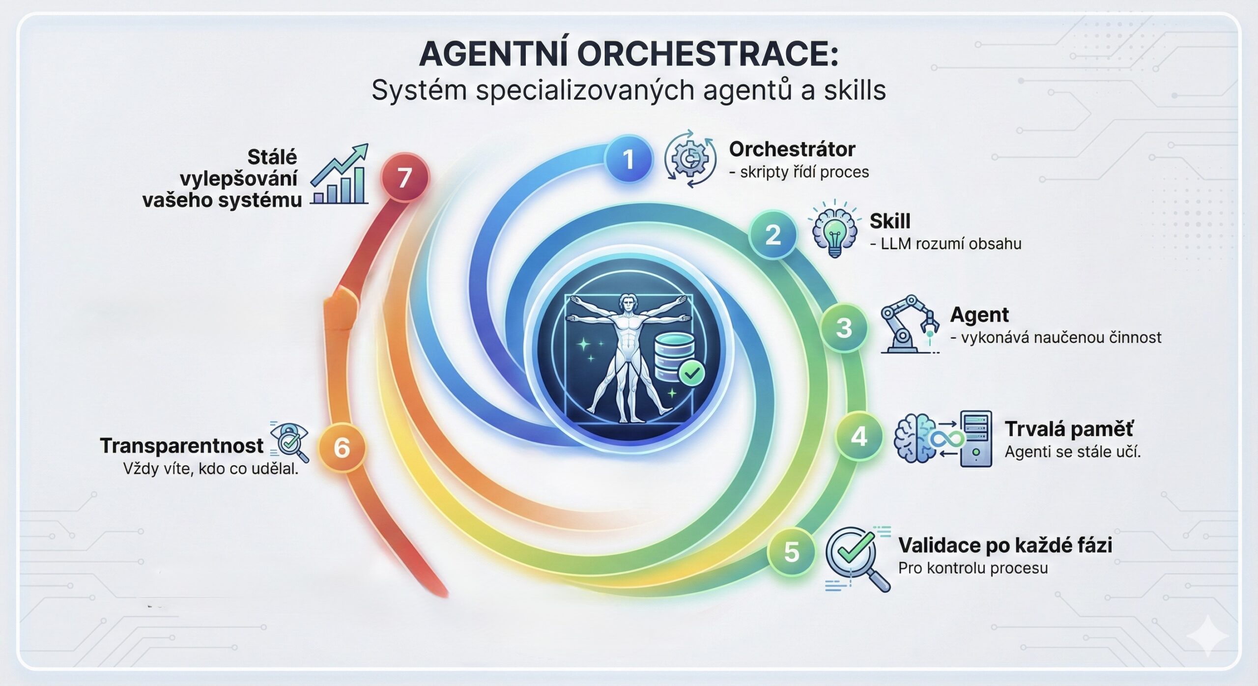 Ale pozor – více agentů neznamená automaticky lepší výsledky. Jak upozorňuje článek o orchestraci agentů: “By 2026, the question will be: how many agents did you deploy and how well did they perform?” Klíčová je orchestrace – koordinační vrstva, která zajistí, že agenti spolupracují, neduplikují práci a směřují ke společnému cíli. Bez ní vzniká chaos. To je přesně to, co dělá hierarchie Meta-orchestrátor → Skill → Agent, kterou jsem popsal výše.