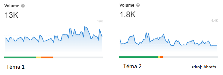 Na obrázku vidíte statistiku hledanosti dvou témat na českém Googlu z nástroje Ahrefs od roku 2015 do 2022. Téma 1 v čase roste, Téma 2 klesá.