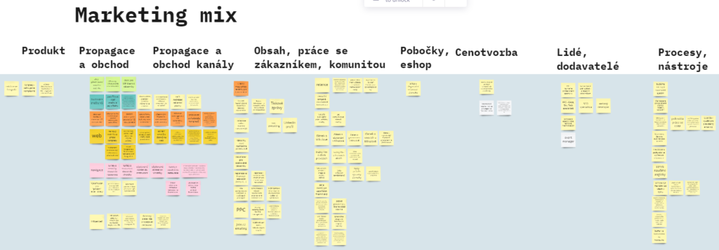 Ukázka z workshopu marketingové strategie pro e-shop od Michala Krutiše. V tomto případě jsme mix rozdělili na více témat, nejsilnější je téma marketingové propagace, práce s obsahem a s interními procesy.