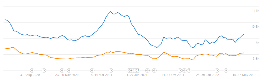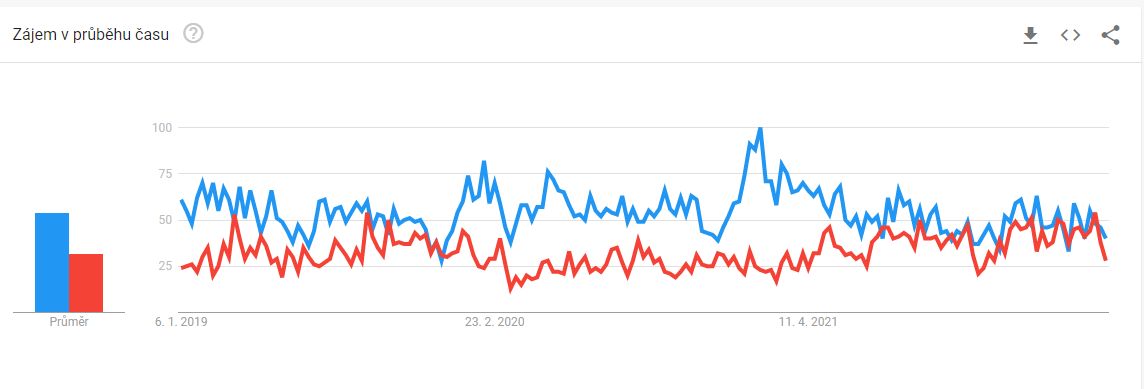 Na obrázku je statistika dvou témat z nástroje Google Trends a jejich vývoje v čase od 2019 do 2022. Téma 1 po pandemiích stagnuje a neopakuje růst (modrá) a téma 2 pozvolna roste, i když během let pandemie bylo naopak v útlumu.