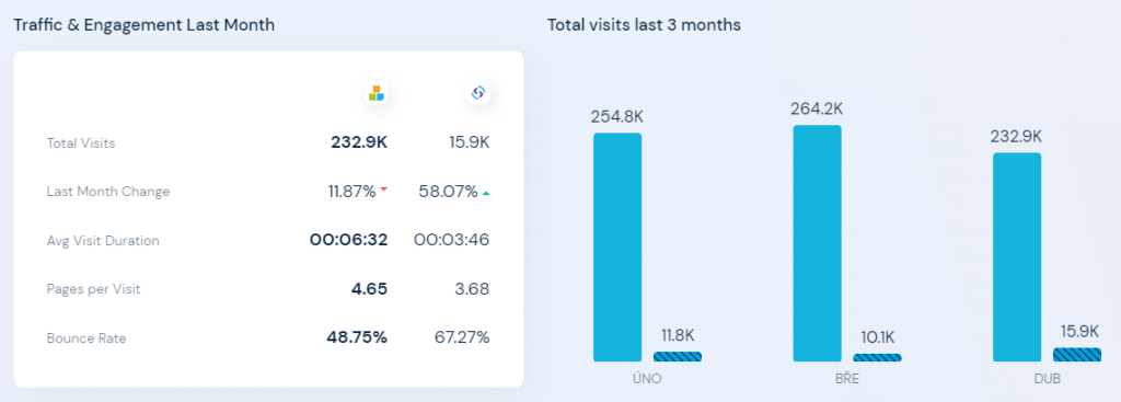 *Obrázek obsahuje odhad návštěvnosti dvou webů podle nástroje Similarweb. Sledujeme nepoměr v návštěvnosti obou webů. Byť druhá značka roste o 50 %, stále klesající první značku má daleko před sebou. *