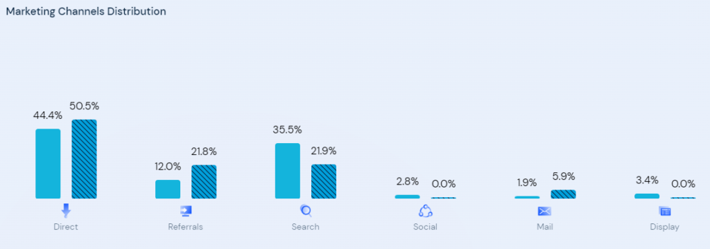 Obrázek ukazuje odhadovaný podíl návštěvnosti konkurenčních webů podle zdrojů návštěv. Je také důležité vědět, z jakého základu se procenta počítají. I tak má druhá značka větší podíl odkazujících webů (referrals) a slabší search (SEO).
