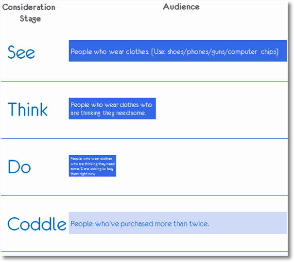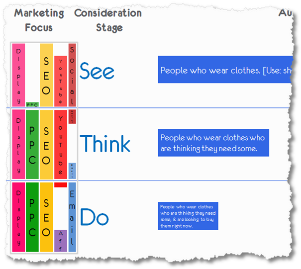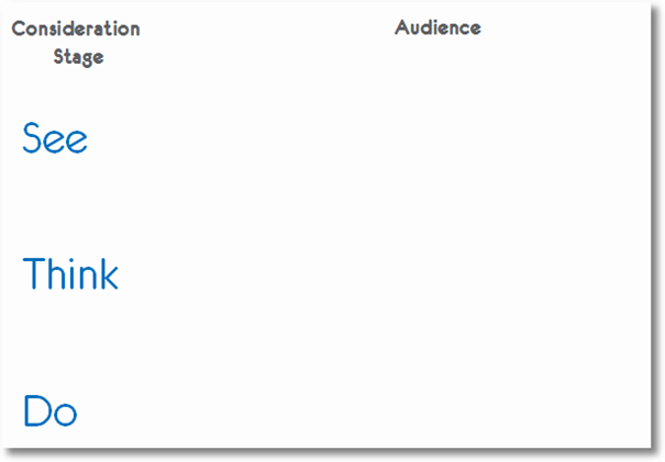 Pokud pracujete na vylepšení SEO pro určitý balíček klíčových slov, na koho tím vlastně cílíte? See-Think-Do? Ano, budou určité případy, kde odpověď bude tak jasná. Většinou ale zjistíte, že klíčová slova obsahují vyjádření záměru a pokud se opravdu zamyslíte nad fázemi uvažování a cílovou skupinou, vytvoříte rozdílný obsah landing pages pro jednotlivé fáze, jiné prvky call to action, budete jinak optimalizovat.