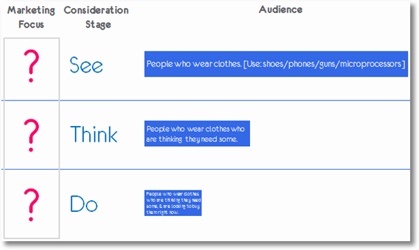 Skupinu ve fázi Think bychom pak mohli definovat jako – všichni lidé, kteří nosí oblečení a myslí si, že budou potřebovat nové.