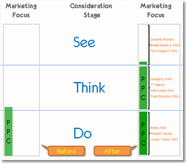 Jak se vůbec mohlo stát, že firma měla na začátku tak roztříštěnou marketingovou strategii? Proč neměla strategii tak komplexní jako na posledním obrázku? Proč neoptimalizovala pro See-Think-Do?