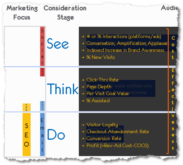 Ale tohle všechno se rozpadne ve chvíli, kdy začnete měřit úspěch vašeho marketingu pro fáze See a Think. V těchto fázích uživatelé nejsou připraveni nakupovat, nejsou připraveni poslouchat vaše argumenty proč nakoupit u vás. Ještě ne.
