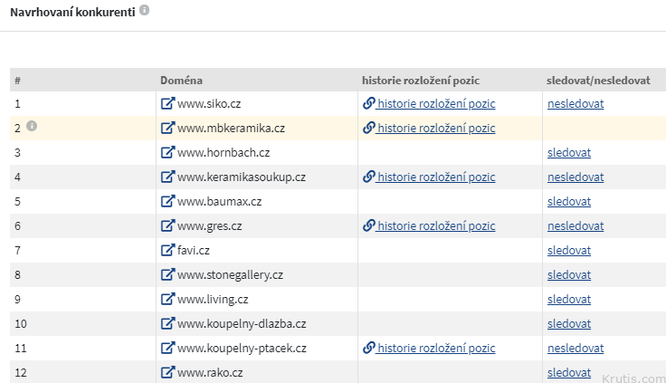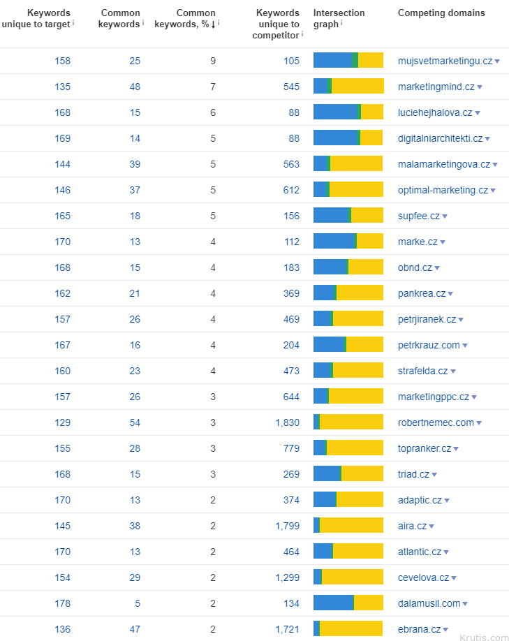 Skvěle zpracovaný návrh konkurence nabízí Ahrefs. Pokud si zadáte svou doménu a získáte report Competing domains, pak se vám ukáže seznam domén, které mají největší překryv s vaším obsahem. Rozumějte se slovy, které Ahrefs vidí u vás a cizí domény ve výsledcích vyhledávání (SERPu). Pro mou doménu to vypadalo například takto. S 1. doménou “mujsvetmarketingu.cz” máme společných 25 slov = 9 %. Já mám na krutis.com zachyceno 158 unikátních slov a konkurent má svých 105 klíčových slov. (Na ty bych se měl podívat, zda je nemám do obsahu webu také zařadit.)