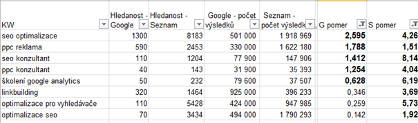 Já jsem v exportu také viděl „konkurenčnost“ slov v podobě počtu vypsaných stránek na dotaz a hledanost dotazů. Můžete si tedy slova pěkně seřadit podle poměru Hledanost/Počet výsledků. Čím vyšší číslo, tím je slovo hledanější, ale má menší konkurenčnost. To se vám velmi dobře hodí při analýze klíčových slov.