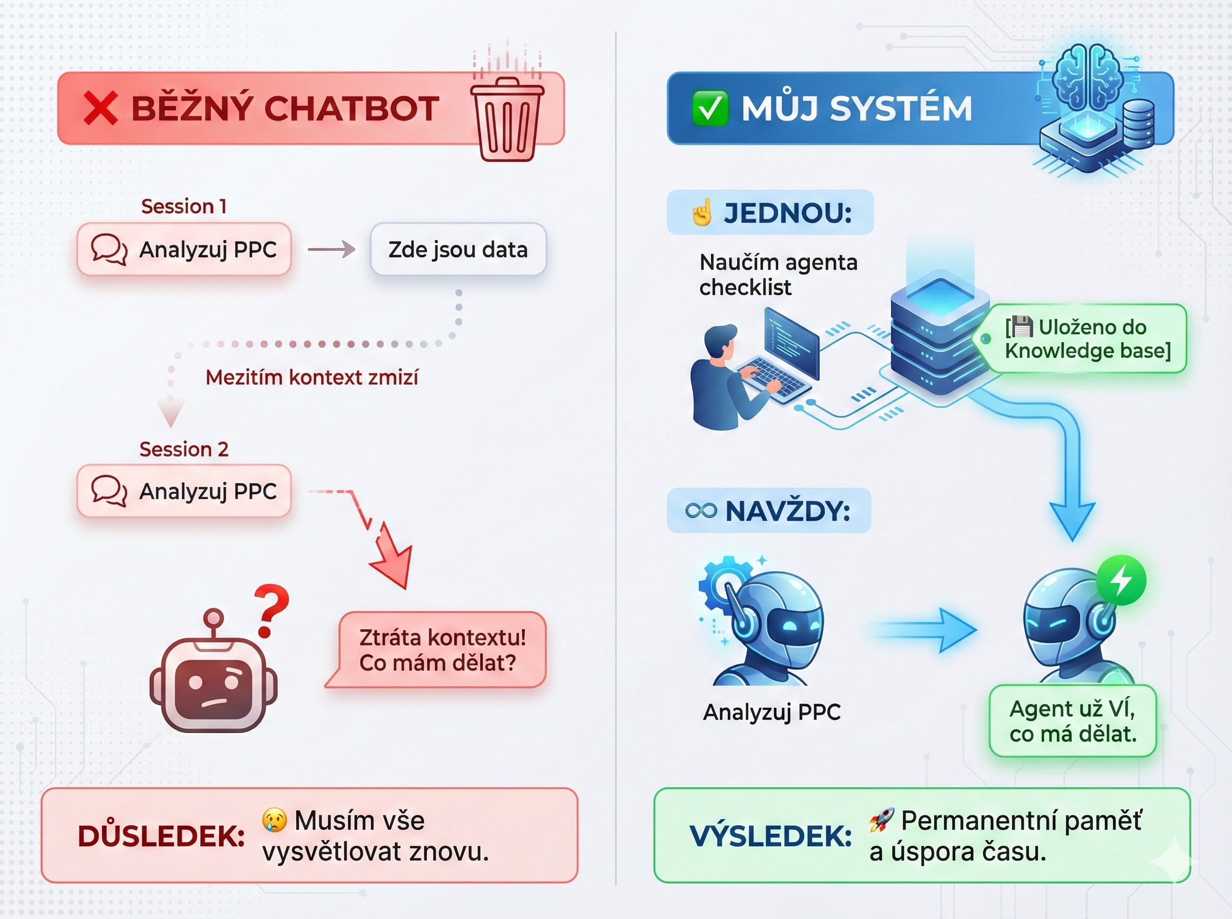 Já nemusím pamatovat checklist ani mu ho pokaždé vysvětlovat. Agent to prostě ví – a když najdu nový vzorec z projektu, přidám ho do znalostní báze a příště už ho zná.