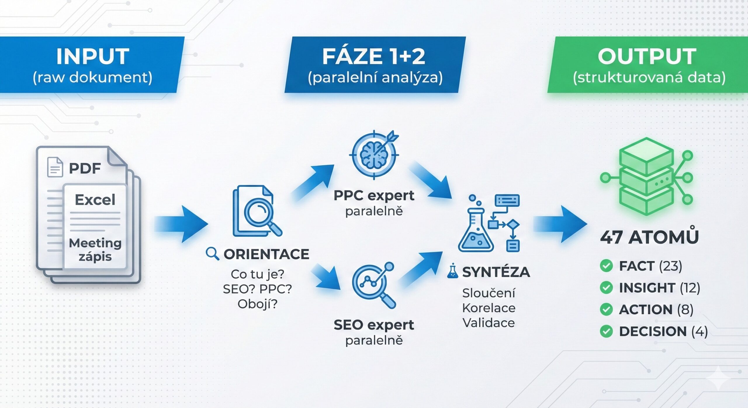 Spuštění specializovaných “ministrů” – každý analyzuje dokument ze svého úhlu pohledu. PPC expert hledá jiné věci než SEO expert. Běží paralelně, takže čas je stejný jako pro jednoho. Každý specialista má vlastní znalostní bázi s checklisty, benchmarky, best practices. Nejen že čte – porovnává s tím, co “ví”.